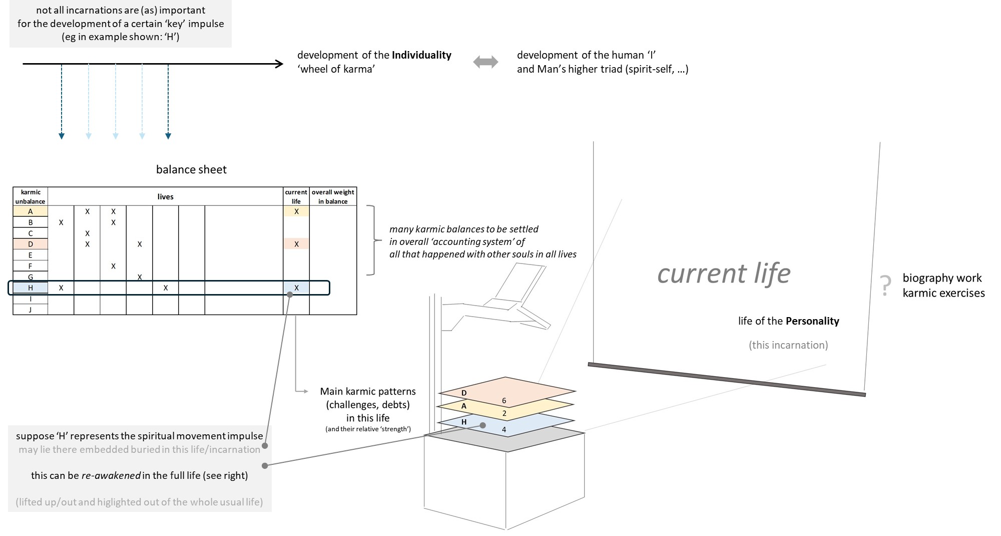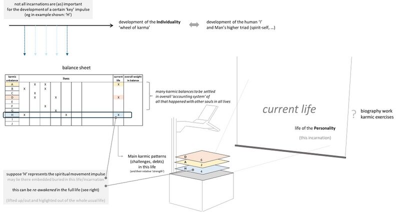 A life typically contains a wealth and complex mix of many karmic balances to be settled in the overall ‘accounting system’ of all that happened with other souls in all previous lives. Rudolf Steiner mentions that not all lives are as important in the grand scheme of (and contribution to) humanity; stating that some are "less important" in having '"little significance for the world outside" (1924-06-01-GA240, 1924-07-18-GA240, 1924-08-24-GA240). This is because some lives have an agenda more filled with interpersonal matters, whereas in others the incarnation is more dedicated to act as a carrier of a larger impulse.