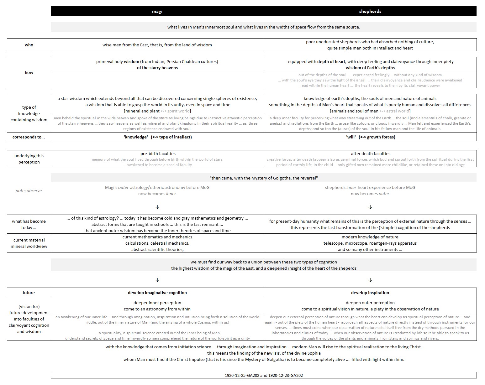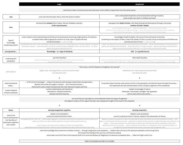 FMC00.695 shows how the magi and shepherds represent two types of human constitution and cognitive faculties of ancient atavistic clairvoyance from which followed knowledge of the spiritual in the kingdoms of nature and the cosmos. Going down, it shows what has become of these faculties today after the Mystery of Golgotha, and what is to become of this in the future with the arising of conscious clairvoyance that will bring back the knowledge of the spiritual through knowledge of the astral and lower spirit worlds.
