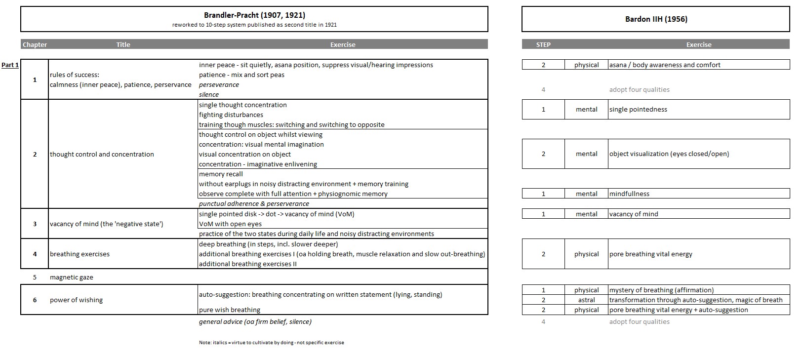 FMC00.696 shows a table with comparative mapping of initiation exercises in Karl Brandler-Pracht's (1864-1939) original book of 1907, reworked and published as a ten-step system in 1921, to the exercises in the first step's of Franz Bardon's Initiation into Hermetics (IIH), published first in 1956 in German with the original title 'The way to true adepthood'.